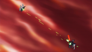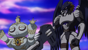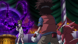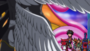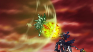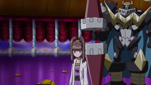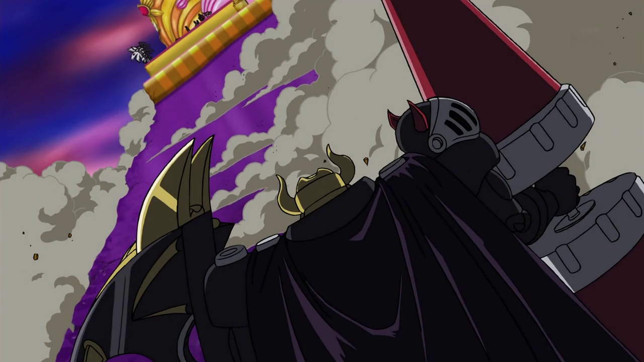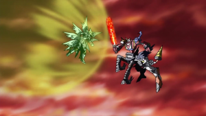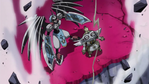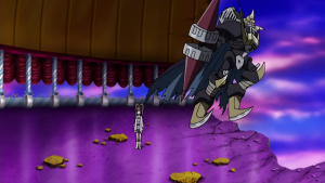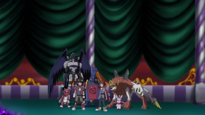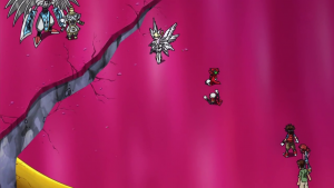 Le sol continue à s’écrouler. Shakkoumon essaie de retenir un pan mais a du mal. Une plume sombre vole près de lui et Beelzebumon apparait pour l’épauler dans la tâche. De leur côté, Lucemon félicite Nene et la remercie de l’incantation qu’elle lui a apprise. Taiki se retourne vers al jeune fille, surpris, et demande si elle travaille pour l’Empire Bagura puis veut savoir qui est ce chevalier noir. Nene ne répond pas tout de suite puis exige que Taiki ne fasse plus rien et observe. Autrement, elle devra les combattre en tant que général et leur montre son X Loader noir. Zenjirô est choqué de cette nouvelle. DarkKnightmon rappelle que Shoutmon est le centre de leur digixross et il pourrait l’achever tant que celui-ci st au sol mais préfère se montrer généreux en se disant qu’ils leur seront peut-être utiles dans l’avenir.