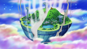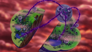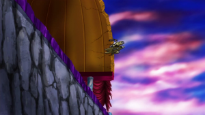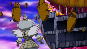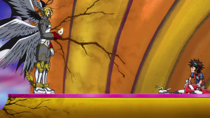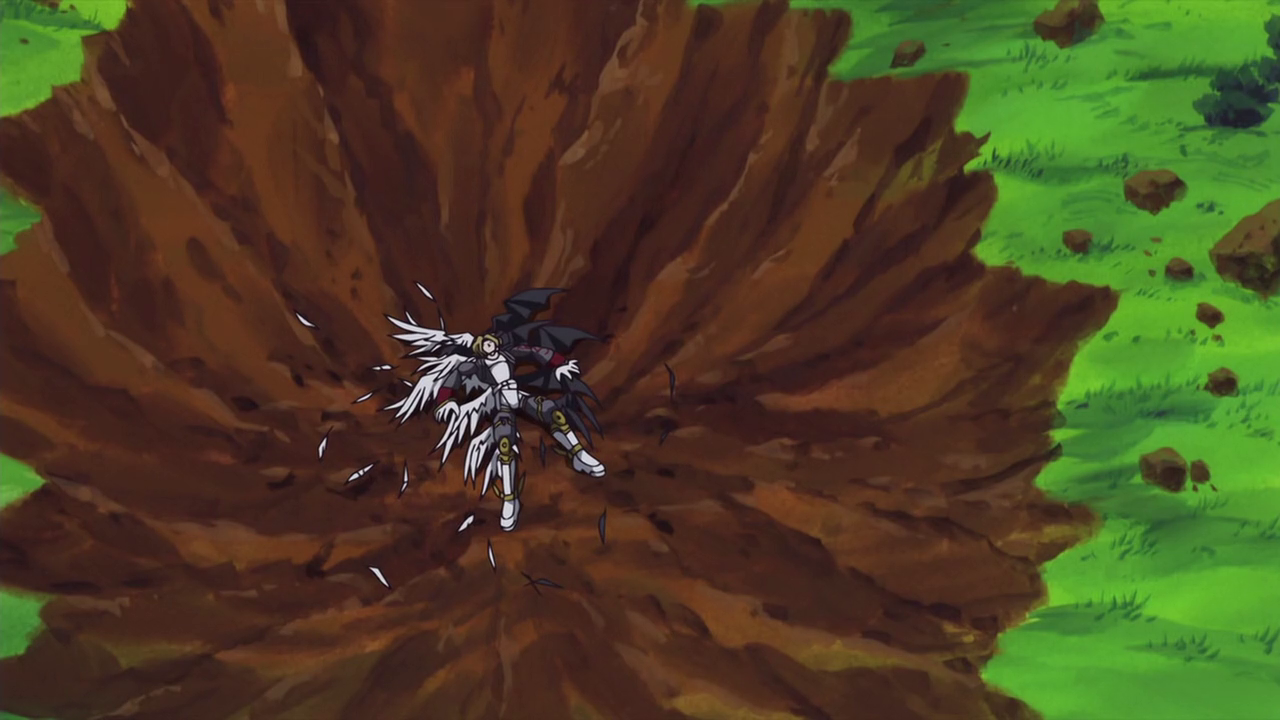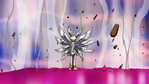 Soudain, Lucemon murmure qu’il ne pouvait rien y faire et que ce n’est pas ici un paradis ordinaire puis se met à rire. Shakkoumon se demande ce qu’il a puis rappelle que si une mauvaise personne devenait chef, le sceau sur les pouvoirs ultimes des ténèbres serait brisé. Lucemon répond le savoir et l’avoir lu puis ajoute attendre cela avec impatience. Il murmure une incantation qui l’enveloppe d’une aura maléfique puis veut faire apparaitre le code couronne. La terre commence à trembler, à se séparer et le bâtiment s’effondre peu à peu. Heaven Zone se sépare en deux. Un temple s’élève ensuite dans le ciel.