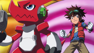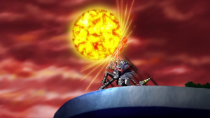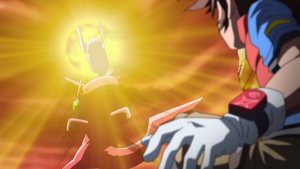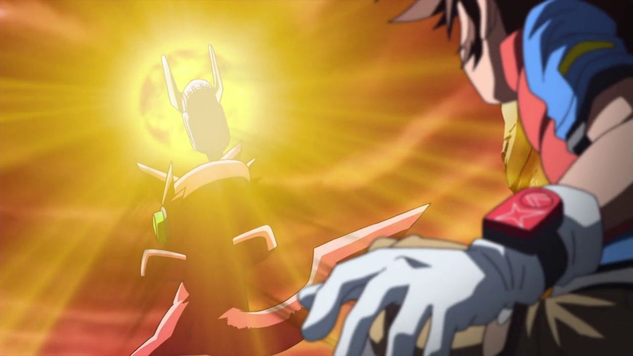 Shoutmon se lève alors et arrête de sa force la sphère de flammes. Shoutmon demande s’il veut savoir comment il se relever puis explique que ses paroles l’ont tant énervé que toute la douleur a disparu. Il alnce ensuite la boule vers Lucemon qui s’écroule en arrière. Shoutmon ajoute qu’un roi ne sacrifie personne pour lui-même et qu’il ne permettra pas à quelqu’un comme lui de régner un millionième de seconde. Tous se réjouissent et Taiki s’exclame que ui est différent de Lucemon et est un vrai roi.
