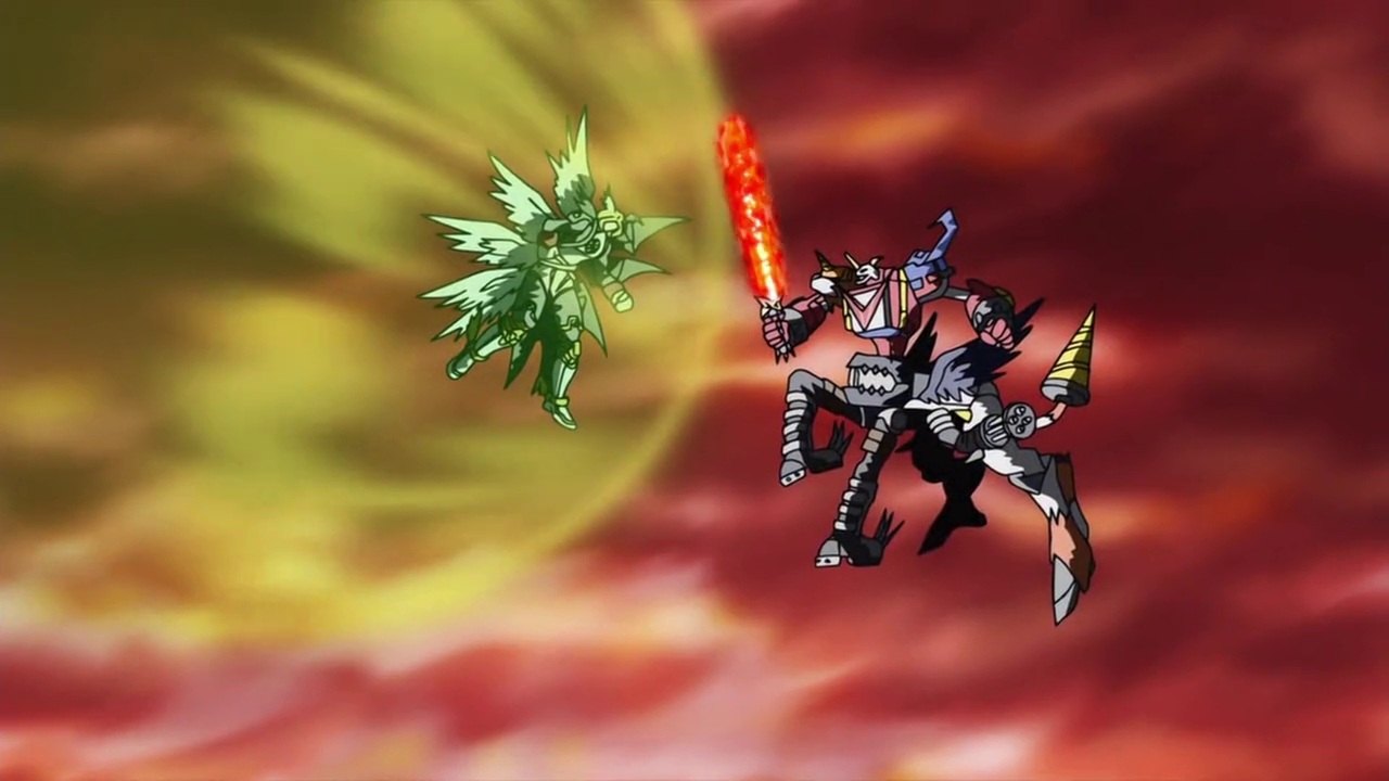 Shoutmon demande une digixross mais Lucemon revient pour l’en empêcher. Beelzebutmon lui tire cependant dessus et l’empêche de les approcher. Taiki en profite pour réaliser une digixross entre Shoutmon, Ballistamon, Dorurumon, Beelzebumon, Pickmon et Starmon qui donne naissance à Shoutmon 4XB. Il s’élance vers son ennemi et le mitraille. Tous deux commencent à se poursuivre puis s’attaquer de front. Lucemon projette ensuite son attaque Dead or Alice. Une grosse sphère de flammes jaillit vers Shoutmon 4XB résiste avec son épée mais Lucemon en envoie deux supplémentaires. Néanmoins, Shakkoumon intervient et les détruit de ses rayons laser verts.