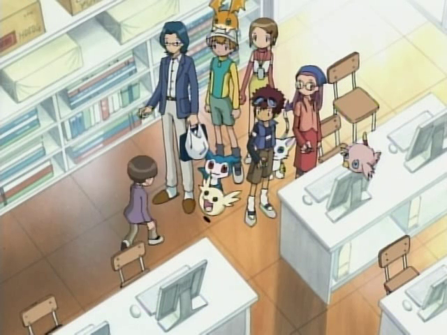 A la salle des ordinateurs, les enfants entendent des bruits de pas et Upamon espère que c’est Iori mais Daisuke sait que ce n’est pas lui car il ne reconnaît le bruit de pas et ordonne à ses amis de se cacher. Tout le monde se met à courir avec les digimon quand Jyô entre dans la pièce. Seul Upamon est très déçu. Jyou trouve étrange de voir des digimon ici même s’il était pourtant au courant. Takeru le présente à Daisuke et Miyako et la jeune fille songe qu’il ressemble au genre de garçon qui a de bons résultats à l’école. Hikari présente Daisuke et Miyako à Jô puis Takeru lui dit qu’ils ont reçu un signal SOS du Digital World et Jou déclare qu’il croit que c’est Gomamon. Takeru comprend donc que son digivice à réagi au SOS.