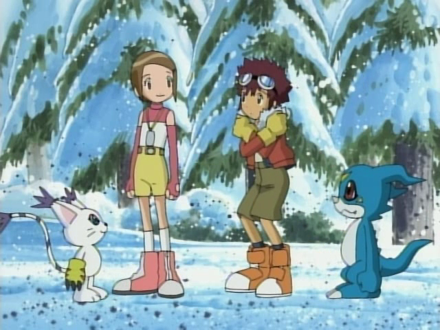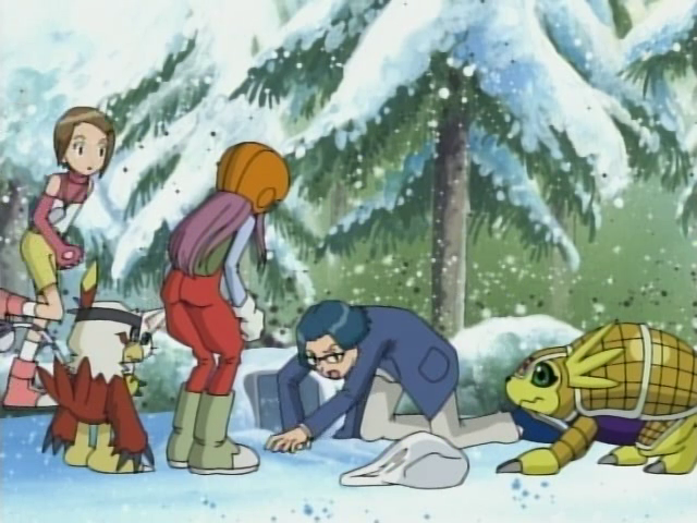 Au Digital World, Daisuke grelotte de froid et demande à Hikari si elle va bien mais celle ci semble supporter mieux le froid que lui. Iori s’approche de Jô et s’excuse d’avoir été interrompu et veut reprendre ses présentations mais Daisuke le coupe encore en s’écriant que ce n’est pas le moment des présentations. Jô distribue des serviettes chaudes à tout le monde tandis que Takeru s’exclame que c’est leur Jô préparé à n’importe quoi. En essayant de se réchauffer, Miyako laisse la sienne tomber et celle-ci fait fondre de la neige, révélant le visage de Gomamon.