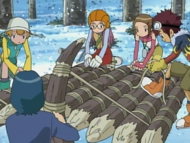 Dans les instants qui suivent, les digimon se mettent à utiliser leurs attaques pour abattre des arbres tandis que les Enfants Elus utilisent les troncs pour fabriquer un traîneau. Une fois fini, les digimon sont attachés devant pour le tirer. Armadimon dit que comme c’est pour détruire la Dark Tower, ils comprennent et Hawkmon ajoute exactement. Iori dit à Armadimon qu’il compte sur lui mais le digimon détourne la tête.