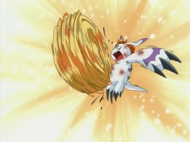 Aussitôt tous les Gizamon se tournent vers le digimon et effectuent des roulades blessant un par un Gomamon qui s’écroule au sol. Le Digimon Kaiser en déduit qu’il ne savait que parler puis Wormmon lui demande s’il va les laisser se reposer mais il le refuse et utilise des anneaux noirs. Ceux-ci prennent le contrôle des Gizamon et le Digimon Kaiser s’exclame qu’ils sont alors moins fatigués et leur ordonne de terminer les prisons de ce secteur.