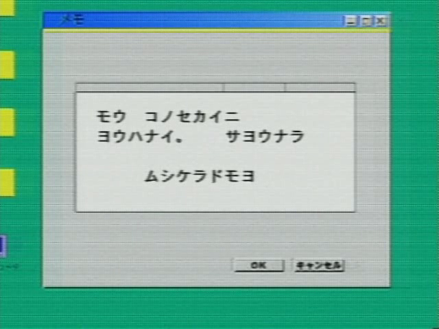 Dans l’appartement des Ichijouchi, la mère de Ken s’inquiète car leur fils n’est pas sorti de sa chambre de toute la journée. Son père prend conscience qu’il se comporte ainsi depuis le dernier match de football et se demande si quelque chose ne va pas. La mère s’interroge sur ce qu’elle peut faire et pourquoi elle ne sait rien. Le père lui demande si ses professeurs ne disent rien mais la mère raconte qu’ils ont dit de le laisser se débrouiller lui-même. Elle explique que Ken est trop gentil et ceux-ci ne savent donc pas ce qu’ils pensent. Ainsi ils l’ont abandonné. Le père juge cela irresponsable puis décide d’enfoncer la porte. Son épouse veut l’arrêter mais celui-ci le fait quand même et arrive dans la chambre de son fils, vide. Il entre et cherche son fils quand son épouse s’approche du bureau. Son regard se pose sur l’ordinateur, où est écrit un message, et devient très pâle puis appelle son mari. Celui ci la rejoint et lit le message: « Je n’ai plus d’utilité pour ce monde. Au revoir, petits moucherons » et se demande ce que cela signifie tandis que sa femme panique complètement et se demande ce qu’ils vont faire.
