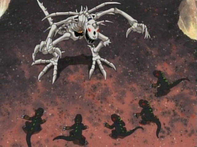 Le digimon squelettique s’approche des Enfants Elus quand Nefertimon et Pegasmon s’interposent devant eux. Nefertimon leur crie de fuir mais Hikari leur demande de venir avec eux. Pegasmon leur explique qu’ils l’occuperont et Nefertimon leur dit ainsi de trouver un endroit en sécurité.