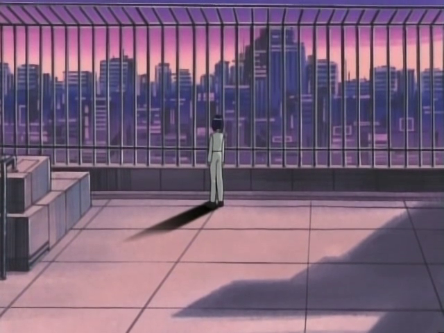 Sur le toit de son immeuble, Ken observe son quartier et le reste de la ville qu’il peut voir au loin puis saisit les barreaux du grillage entre ses mains en criant petits moucherons.