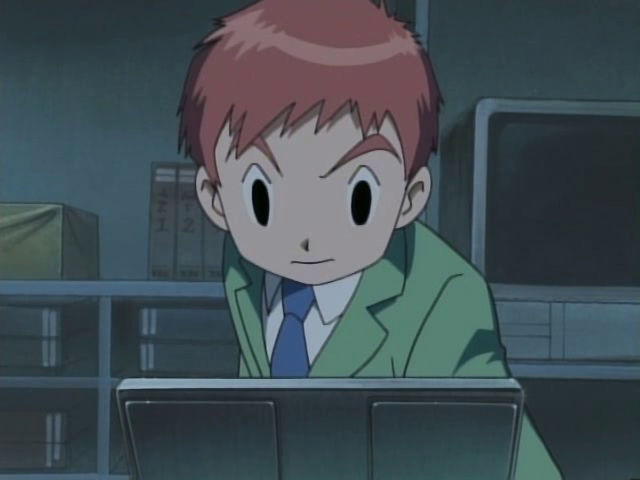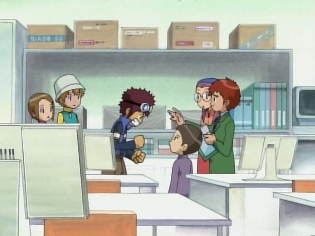 Dans la salle des ordinateurs, Koushiro est littéralement abasourdi par la nouvelle et Daisuke le répète: le Digimon Kaiser est le génie Ichijouchi Ken. Iori se demande pourquoi un garçon comme lui ferait de telles choses et Hikari n’arrive pas à y croire. Takeru se rappelle avoir vu encore un reportage sur lui à la télévision chez lui. Koushiro songe que leur ennemi était plus proche qu’il le croyait et décide d’enquêter davantage. Takeru ne semble pas comprendre et Koushiro explique qu’il veut entrer en contact avec Ichijouchi Ken. Soudain, Upamon dit qu’il est d’accord mais qu’il a faim. Koushiro fait remarquer que Miyako est en retard quand la jeune fille entre dans la salle avec un sac de nourriture. Les digimon accourent vers eux sauf Poromon qui reste un peu à l’écart car il veut des kanpyoumaki faits par la mère de Iori. Miyako demande alors s’il ne veut rien mais Poromon répond que si.