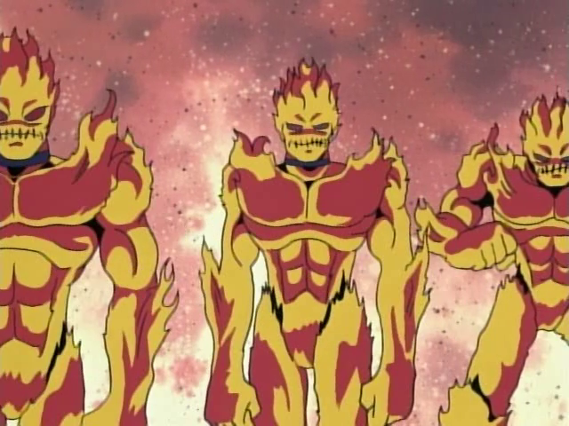Dans le désert, les Enfants Elus avancent et Daisuke se demande où est Ichijouchi Ken quand des flux de lave s’émanent de plusieurs failles d’où sortent plusieurs Meramon. Hikari les reconnaît tout de suite et Daisuke de s’en charger. Il fait armor évoluer V-mon en Fladramon tandis que Hikari et Miyako courent se mettre à l’abri puis Fladramon lance son attaque Knuckle Fire mais elle ne fonctionne pas.