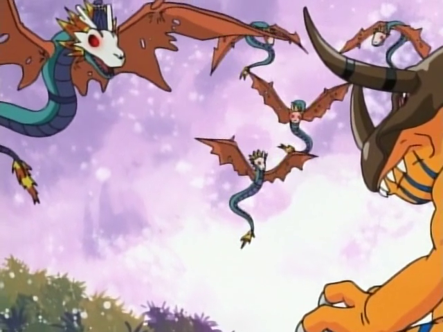 Pendant ce temps, Greymon marche dans une forêt quand il aperçoit plusieurs Airdramons venant vers lui avec le Digimon Kaiser Kaiser sur l’un d’eux.
