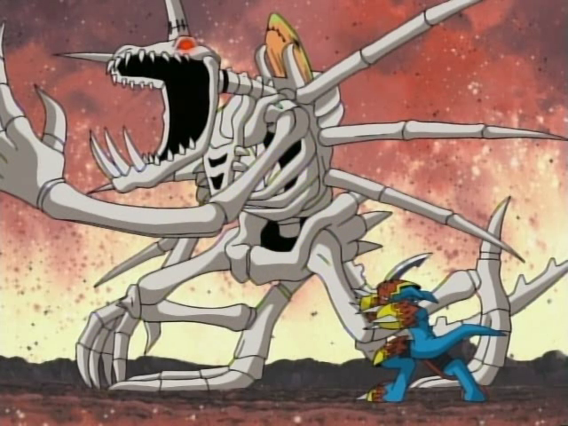 Brusquement, Skullgreymon s’en prend aux Meramon et rapidement, Fladramon, Holsemon et Digmon se précipitent vers lui. Fladramon lance son attaque Knuckle Fire mais cela ne l’affecte puis est jeté au sol où il régresse en V-mon. C’est le tour de Digmon mais lui aussi se retrouve vite à terre et redevient Armadimon. Holsemon essaie aussi mais Skullgreymon l’envoie aussi au sol et il régresse en Hawkmon.