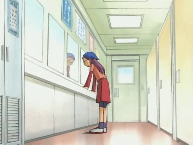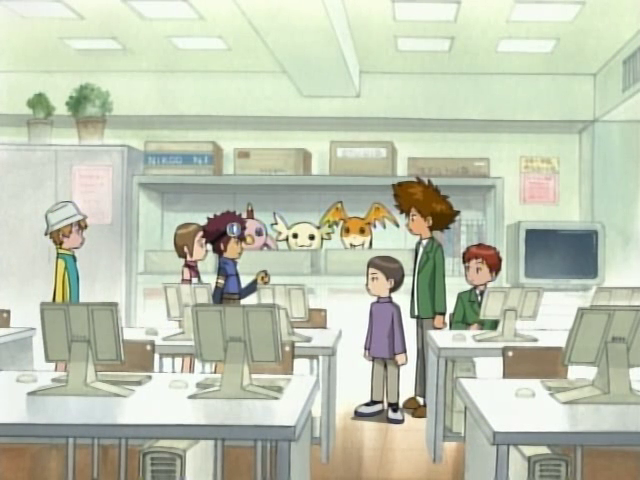 Courant à travers les couloirs de l’école, Daisuke, Hikari et Takeru arrivent à la salle des ordinateurs où Taichi les accuse d’être en retard. Daisuke lui dit de ne pas s’inquiéter car ce n’est pas la faute de Hikari et explique qu’ Okada s’est montré grossier en commençant à jouer au hockey et Takeru ajoute qu’ils ont subi un sermon des professeurs. Taichi demande qui est cet Okada et Daisuke répond que c’est un camarade de classe du même groupe de nettoyage qu’eux, ce qui semble rendre Taichi plus furieux. Hikari coupe alors Daisuke et dit que c’est aussi sa faute car elle n’a pas su l’arrêter puis le remercie. Daisuke demande où est Miyako mais Poromon répond qu’elle n’est toujours pas là et Koushiro suppose qu’elle doit être en cours. Daisuke rappelle que les cours sont déjà finis. Taichi lui dit d’aller la chercher et le garçon fonce. Iori décide aussi d’y aller.