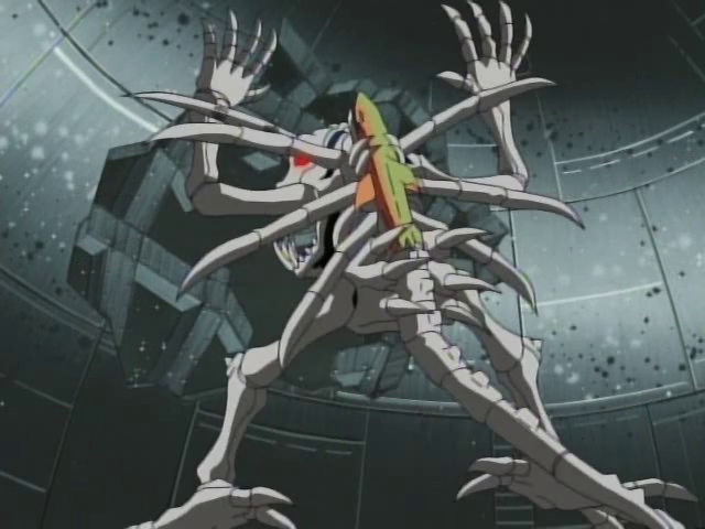 Dans sa base, le Digimon Kaiser fait encore évoluer Greymon démoniaquement mais celui-ci devient une fois de plus Skullgreymon et commence à attaquer autour de lui. Le Digimon Kaiser n’arrive pas à comprendre d’où vient le problème. Skullgreymon lance deux fois son attaque Ground Zero qui détruit une partie du mur puis s’envole pour s’enfuir dans la brèche mais un courant électrique le frappe et il retombe au sol, redevenant Greymon. Brusquement, le Digimon Kaiser semble comprendre quelque chose et se lève. Wormmon lui demande s’il a compris et celui-ci répond que c’est possible puis force à nouveau Greymon à évoluer démoniaquement tandis que Wormmon l’observe en silence.