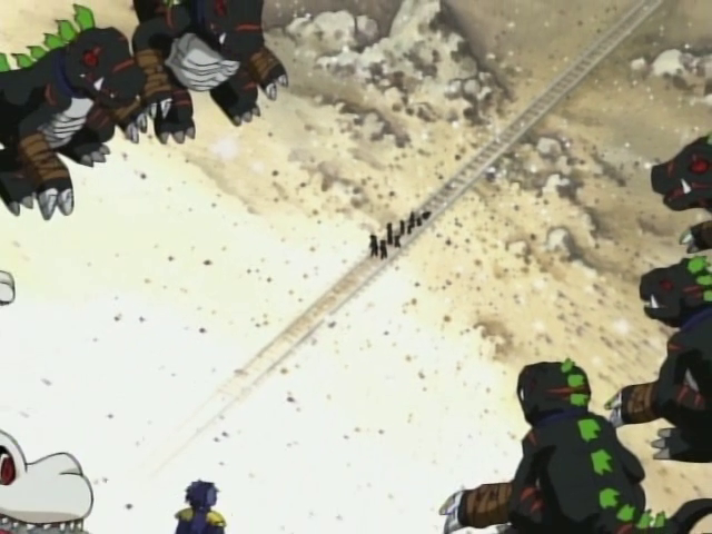 Pendant ce temps, les Enfants Élus marchent le long d’une voie ferrée. Avec sur son dos Agumon, Taichi lui demande s’il a encore mal et Agumon assure qu’il va bien, remerciant son partenaire. Soudain, ils entendent un ricanement au-dessus d’eux et Takeru s’écrie que c’est Ichijouchi Ken. Le Digimon Kaiser s’exclame que c’est Digimon Kaiser. Pour l’énerver, Daisuke ne cesse de répéter plusieurs fois son vrai nom. Le Digimon Kaiser réplique qu’il va le tuer. Brusquement, Taichi déclare que c’est son adversaire et dépose Agumon au sol puis dit qu’il espère qu’il est prêt. Le Digimon Kaiser demande à Taichi s’il n’est pas honteux qu’un collégien soit autant en colère contre un écolier. Iori s’écrie qu’il qu’il est plus jeune que lui mais ne veut pas du tout le fréquenter et ajoute qu’il est une disgrâce pour tous les humains puis lance vers le Digimon Kaiser son bâton.