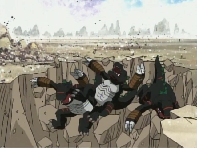 Rapidement, Fladramon envoie son attaque Fire Rocket sur un Darktyrnnomon et détruit son Evil Ring et Digmon utilise Big Crack créant une faille dans laquelle tombe trois autres Darktyranomon. Fladramon dirige ensuite son attaque Knuckle Fire vers le Digimon Kaiser qui le manque de vraiment très peu. Ce dernier s’enfuit juste à temps sur un Airdramon.