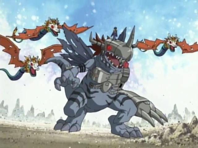 Agumon lance ses flammes vers Taichi et Daisuke plonge pour le sauver. Iori constate qu’Agumon est à nouveau contrôlé. Le Digimon Kaiser tend son digivice et ordonne à Agumon d’évoluer démoniaquement. Agumon devient alors Metalgreymon, sauf qu’il est bleu indiquant qu’il est infecté par un virus. Hikari crie et Takeru constate qu’il est différent. Le Digimon Kaiser se réjouit car Agumon a évolué de la manière qu’il le désirait.