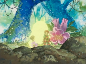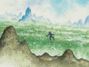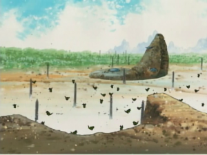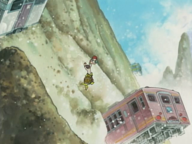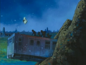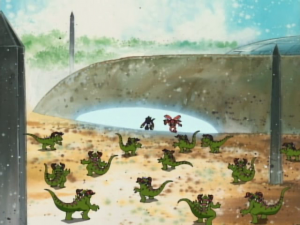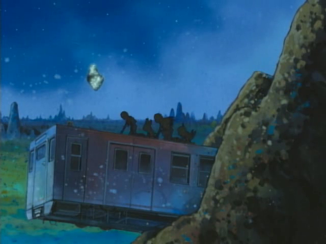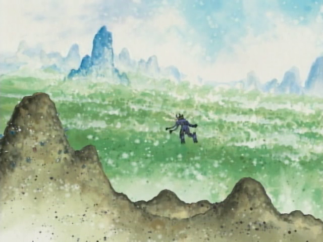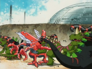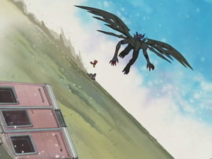 A la tombée de al nuit, grâce aux herbes, Hawkmon peut à nouveau bouger librement. Il en remercie Tailmon quand ils perçoivent un son particulier. Ils s’avancent et aperçoivent dans le ciel la fameuse base.Elle volait… comme Miyako l’avait imaginé.