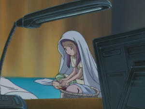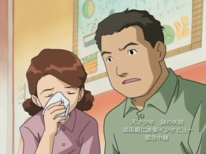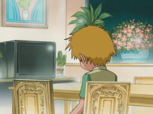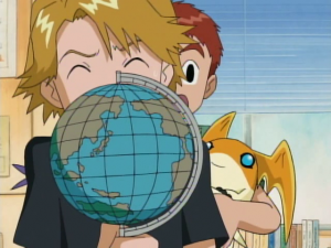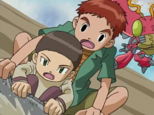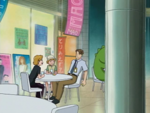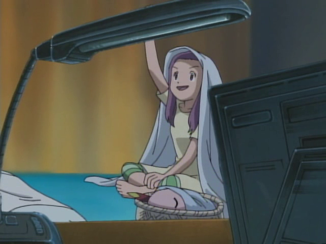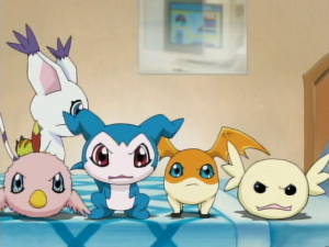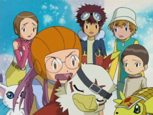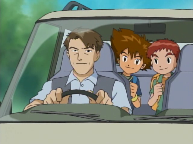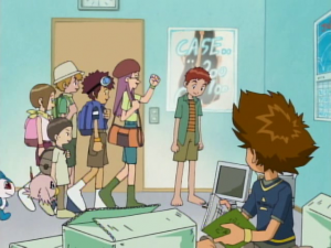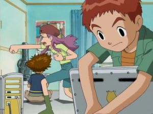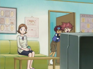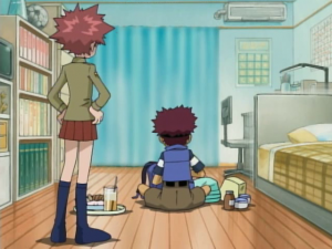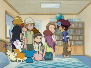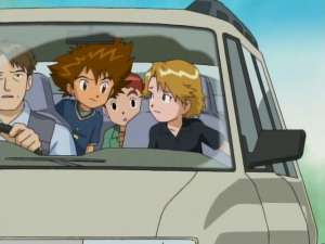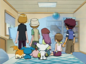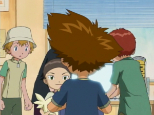 Soudain, la mère de Kôshirô frappe à la porte et tous se précipitent pour adopter une position à peu naturelle et trouver une palce pour les digimon. Mme Izumi veut savoir de quoi ils peuvent discuter et son fils, embarrassé, explique qu’ils aimeraient aller acmper. Elle juge l’idée excellente mais rappelle qu’il leur faudra un adulte pour les accompagner. Yamato assure que son père viendra avec eux avec aplomb, ce qui inquiète un peu Taichi.