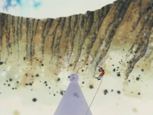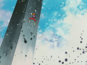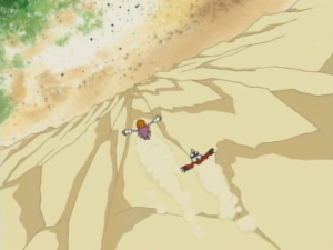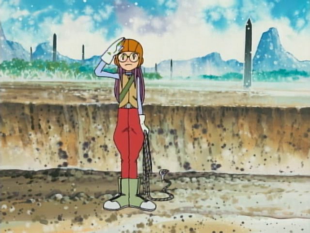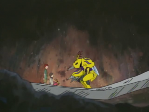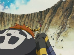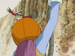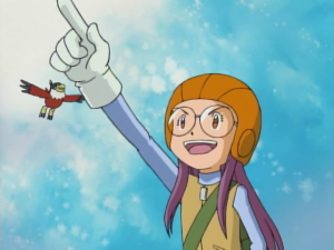 Au Digital World, l’équipe fait l’ascension de la falaise et Iori recommande à tous d’être prudents. Miyako ne l’écoute et se précipite à toute allure au sommet quand Tentomon rapporte que la base a disparu. Sous leurs yeux, ils découvrent effectivement le vide. Armadimon déclare que la base était posée là où se trouve le grand trou. A ce moment, Miyako descend rapidement pour inspecter les lieux, désespérant ses amis. Les Enfants Élus s’interrogent sur cette mystérieuse disparition et Daisuke propose de partir à la recherche de la base. En montant au sommet d’une Dark Tower, Miyako crie que al base s’est envolée dans le ciel. Hawkmon lui ordonne vite de redescendre puis Miyako se met à accuser Tentomon et lui ordonne de dire où est la base. Hawkmon se met à s’excuser à sa place auprès du digimon. Miyako se décide ensuite à descendre dans le trou au moyen d’une corde. Hawkmon la suit à nouveau et essaie de la faire remonter mais celle-ci refuse d’écouter, concentrée sur l’objectif. Soudain, un Dokugumon émerge du sol et se dirige vers eux, lançant en même temps un jet de poison vers la jeune fille. Hawkmon se précipite pour la sauver et est blessé à sa place.