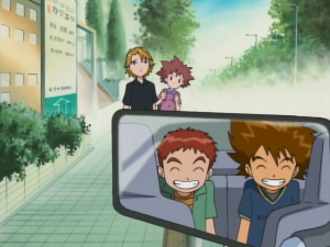 Le lendemain matin, l’équipe se réunit chez Takeru et termine ses derniers préparatifs avant le grand voyage. Miyako est toute enflammée, n’arrêtant pas de crier et de gesticuler. Patamon demande ce qu’elle a et Poromon répond l’ignorer mais qu’elle est ainsi depuis le réveil. Kôshirô annonce que le portail est prêt et Miyako se précipite pour l’ouvrir. Tous partent. Taichi, Yamato et Kôshirô descendent ensuite rejoindre M. Ishida dans sa voiture. Ils ont cependant al désagréable d’apercevoir June devant le véhicule. Taichi demande à Yamato de s’en débarrasser qui va vers elle à contrecœur. A l’arrière, Kôshirô murmure que Daisuke a encore mis Yamato et Taichi répond, amusé qu’être populaire n’est pas facile. A l’extérieur, June s’étonne de ne pas voir son frère et ses amis. Yamato invente que ceux-ci sont partis dans une autre voiture avec un collègue de son père. Il ajoute avoir un service à lui demander mais veut auparavant que celole-ci compte jusqu’à dix en fermant les yeux. June obéit et Yamato retourne vite à la voiture où ses deux amis sont morts de rire puis demande à son père de démarrer en douceur. M. Ishida lui jete un regard suspicieux mais obéit. Ainsi, quand, June se retourne, elle est toute seule.