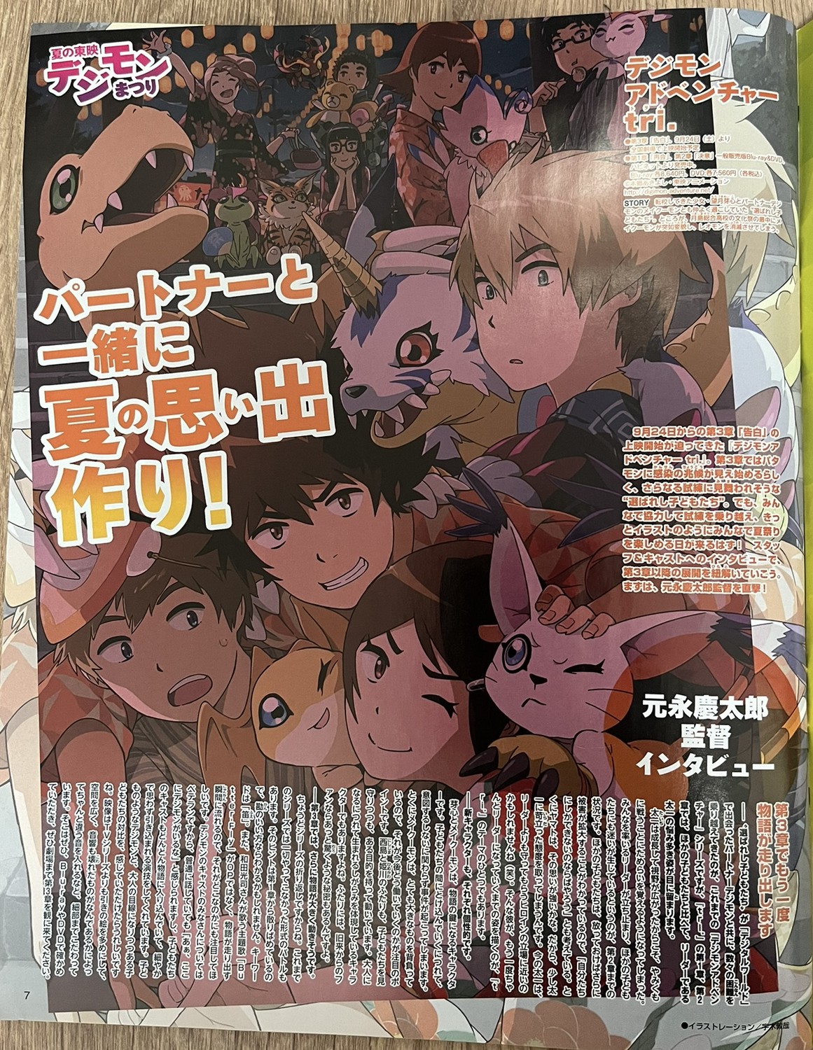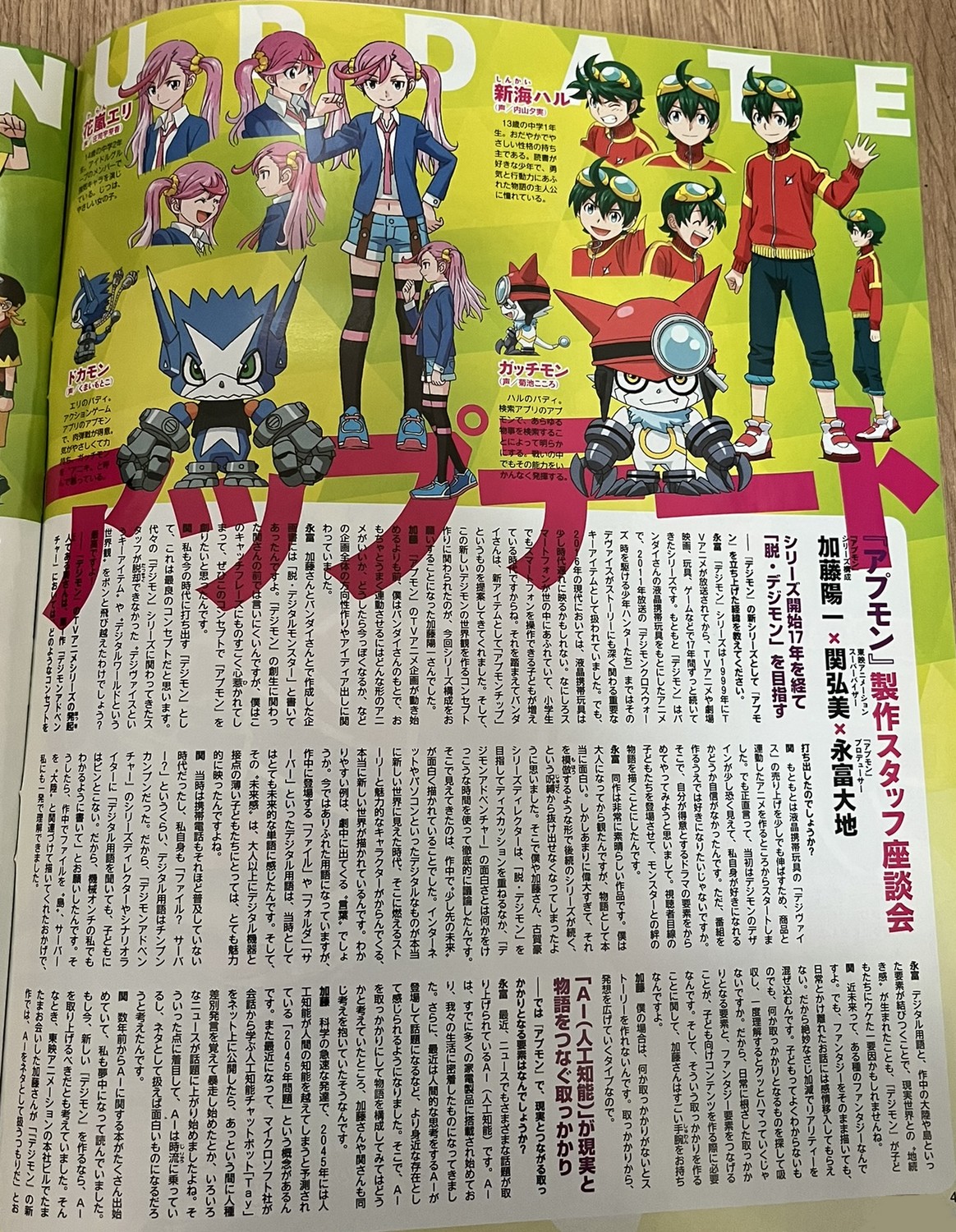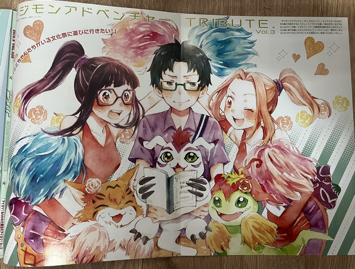 Dans ce numéro, Digimon Appmon est en promotion car sa diffusion commence en octobre de la même année. On y retrouve une interview des créateurs de la série : Youichi Katô, Hiromi Seki, Daichi Nagatomi, Gô Koga et Daichi Nagatomi. Nos camarades de digi-lab ont traduit l’interview en anglais. En complément, Digimon Adventure tri est également à l’honneur avec une interview de Keitarô Motonaga, Yuuko Kakihara, Shuuhei Arai, Natsuki Hanae et Atsuya Uki. La traduction est également disponible en anglais chez digi-lab.