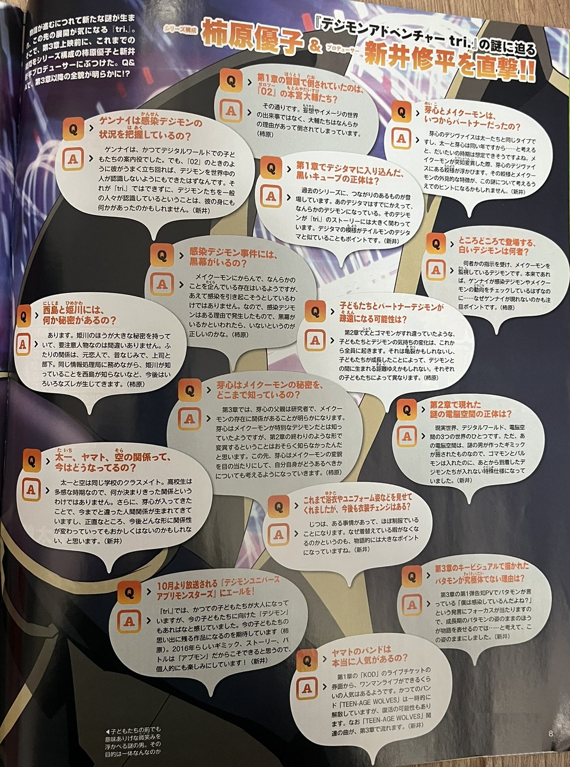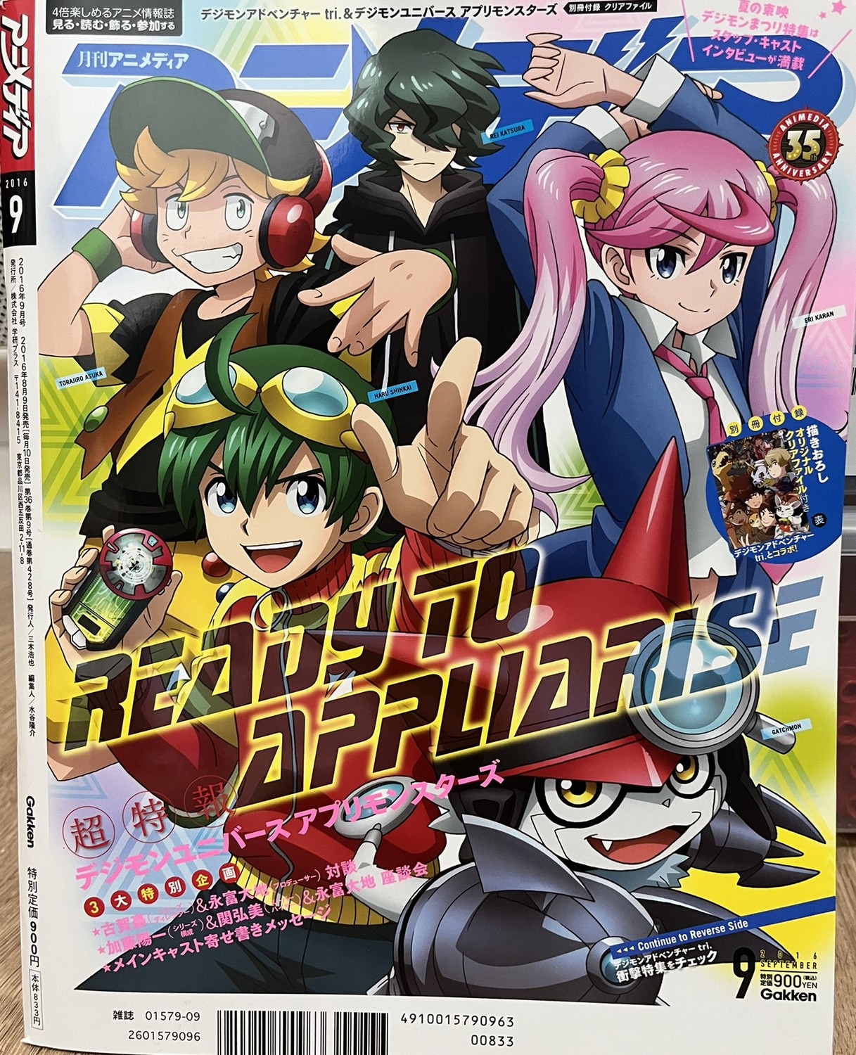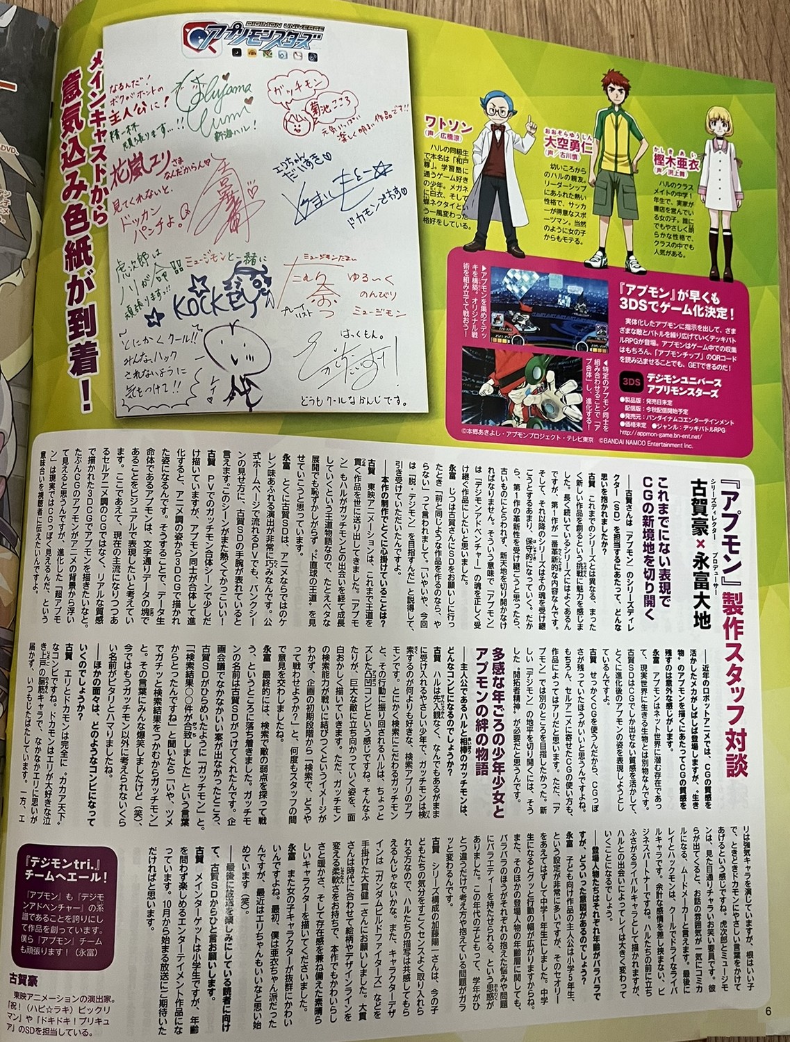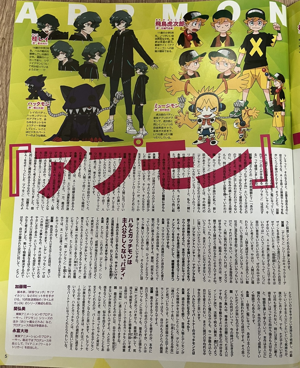 Dans ce numéro, Digimon Appmon est en promotion car sa diffusion commence en octobre de la même année. On y retrouve une interview des créateurs de la série : Youichi Katô, Hiromi Seki, Daichi Nagatomi, Gô Koga et Daichi Nagatomi. Nos camarades de digi-lab ont traduit l’interview en anglais. En complément, Digimon Adventure tri est également à l’honneur avec une interview de Keitarô Motonaga, Yuuko Kakihara, Shuuhei Arai, Natsuki Hanae et Atsuya Uki. La traduction est également disponible en anglais chez digi-lab.