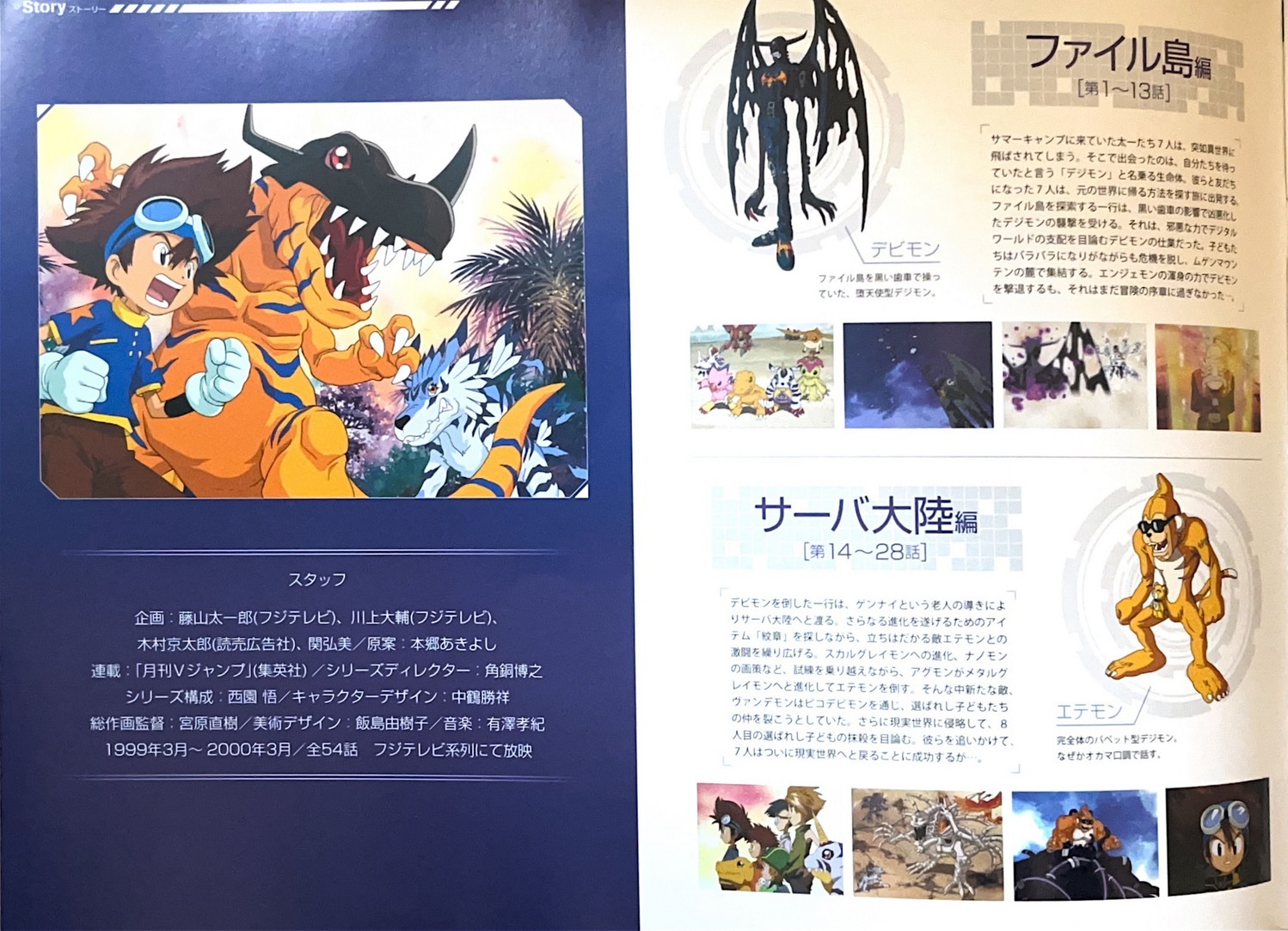 A l’édition du Summer Toei Anime Fair 99, la Toei diffusait pour la première fois l’anime Digimon à travers le film Digimon Adventure dont la date de sortie (6 mars 1999) précédait la date de sortie du 1er épisode de l’anime (7 mars 1999). C’est pourquoi les films de Yu-Gi-Oh! et Dr Slump ont été mis en avant dans le pamphlet, et digimon n’eu le droit qu’à quelques pages en interne. D’un point de vue archéologie digimon, c’est une belle pièce qui nous offre une illustration magnifique.