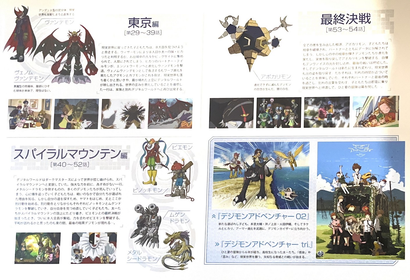 Comme les pamphlets précédents, celui du du 4ème film d Adventure tri contient beaucoup d’interview en japonais. Ce film étant le retour des protagonistes dans le digital world, on y retrouve une double page intéressante qui rappelle que certains lieux de la première saison. Dans les dernières pages, les goodies disponibles à la sortie du film.