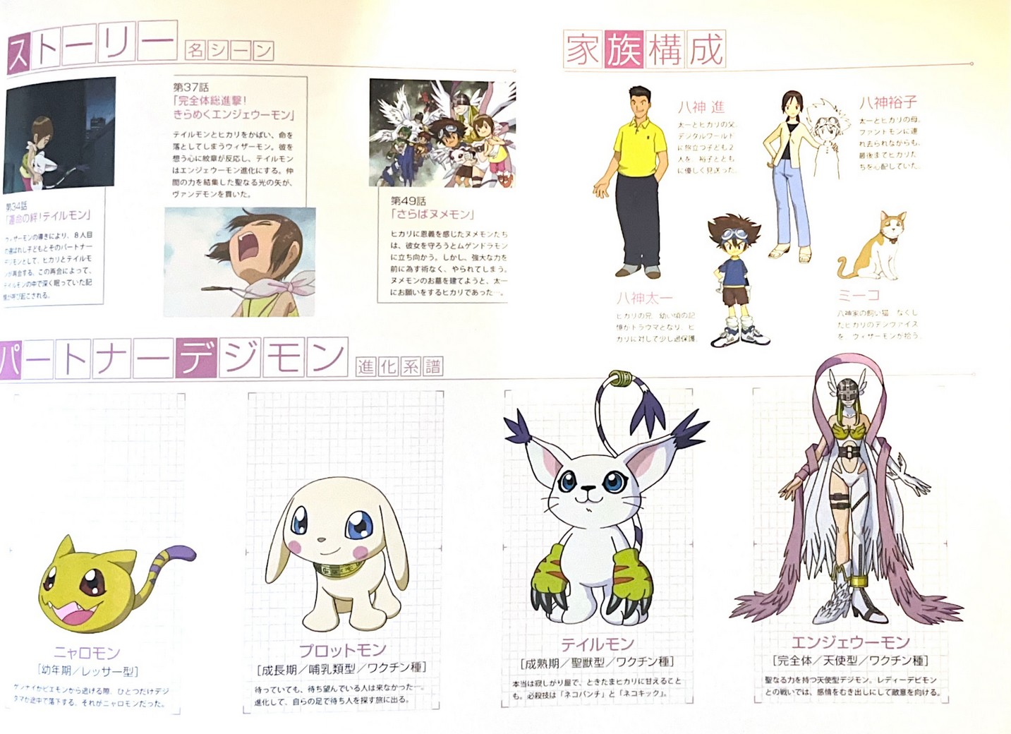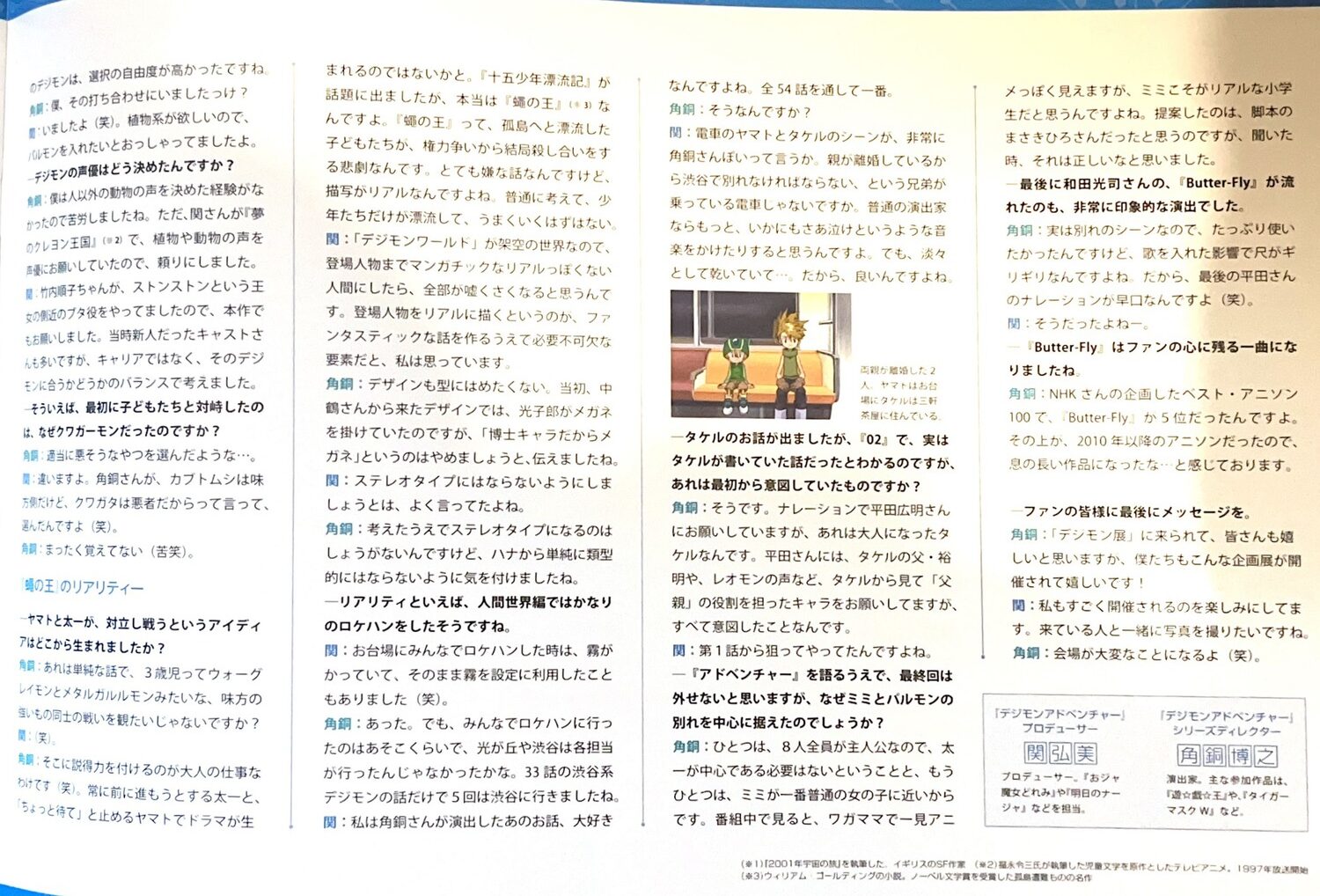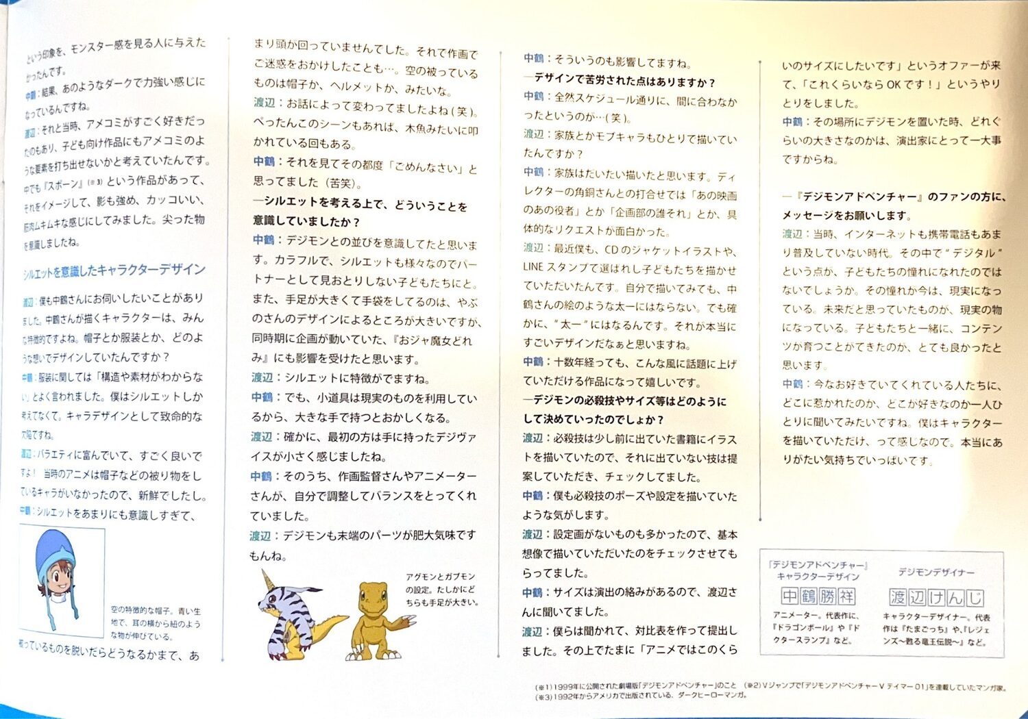 S’agissant du film concluant la saga tri, ce pamphlet offre des messages par le cast de la série, humains et digimon. On y retrouve également une longue interview des seiyuu de Yamato et Gabumon ainsi que de l’illustrateur des digimon Kenji Watanabe.